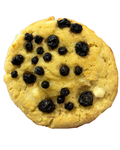 A sweet vanilla cookie with white chocolate chips, stuffed with New York style cheesecake, and topped with dried blueberries.